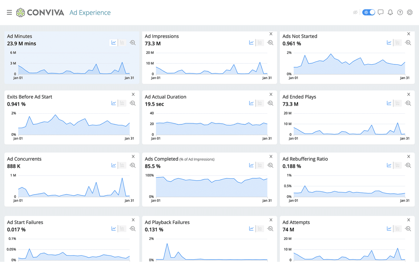• Ad Performance Monitoring: Conviva’s platform tracks key metrics like viewability, completion rate, and engagement of each ad. These metrics give a clear picture of how well your ads are performing.