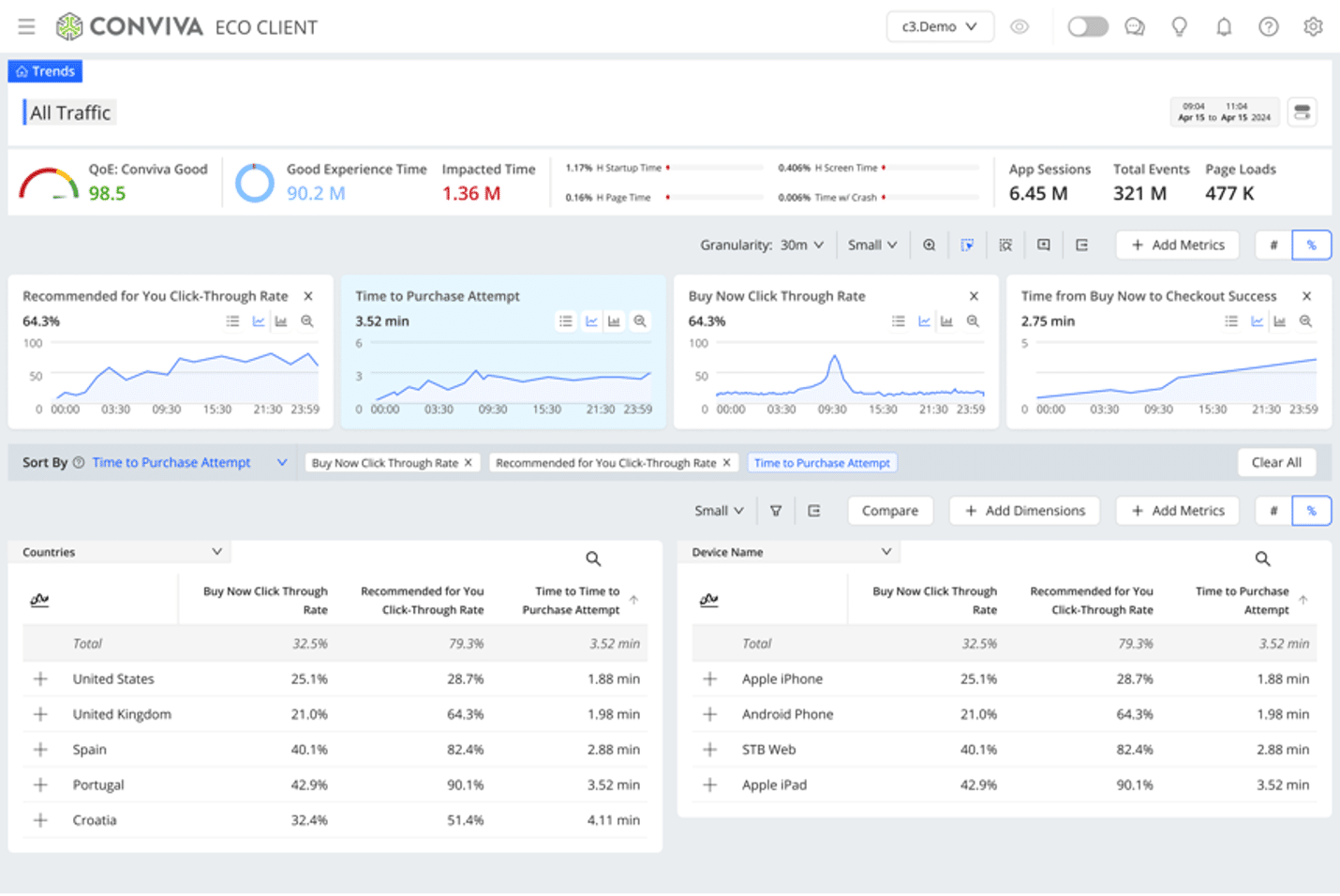 Every experience is unique, so figuring out which touchpoints line up with your team’s KPIs can help illuminate the kinds of metrics you will want to design. Think about the moments that matter most for your business? It could be the signup process, on-boarding new users, the shopping experience itself, or those features that keep people engaged. As a business leader, you’ll want to be sure those experiences are running smoothly, with good conversion rates and no hiccups. That’s the beauty of Stateful Metrics – you can track that performance and get the insights you need to make your application even better. With Conviva Pulse, you can then analyze Stateful Metrics across many different segments, like user location, device type, and internet connection.