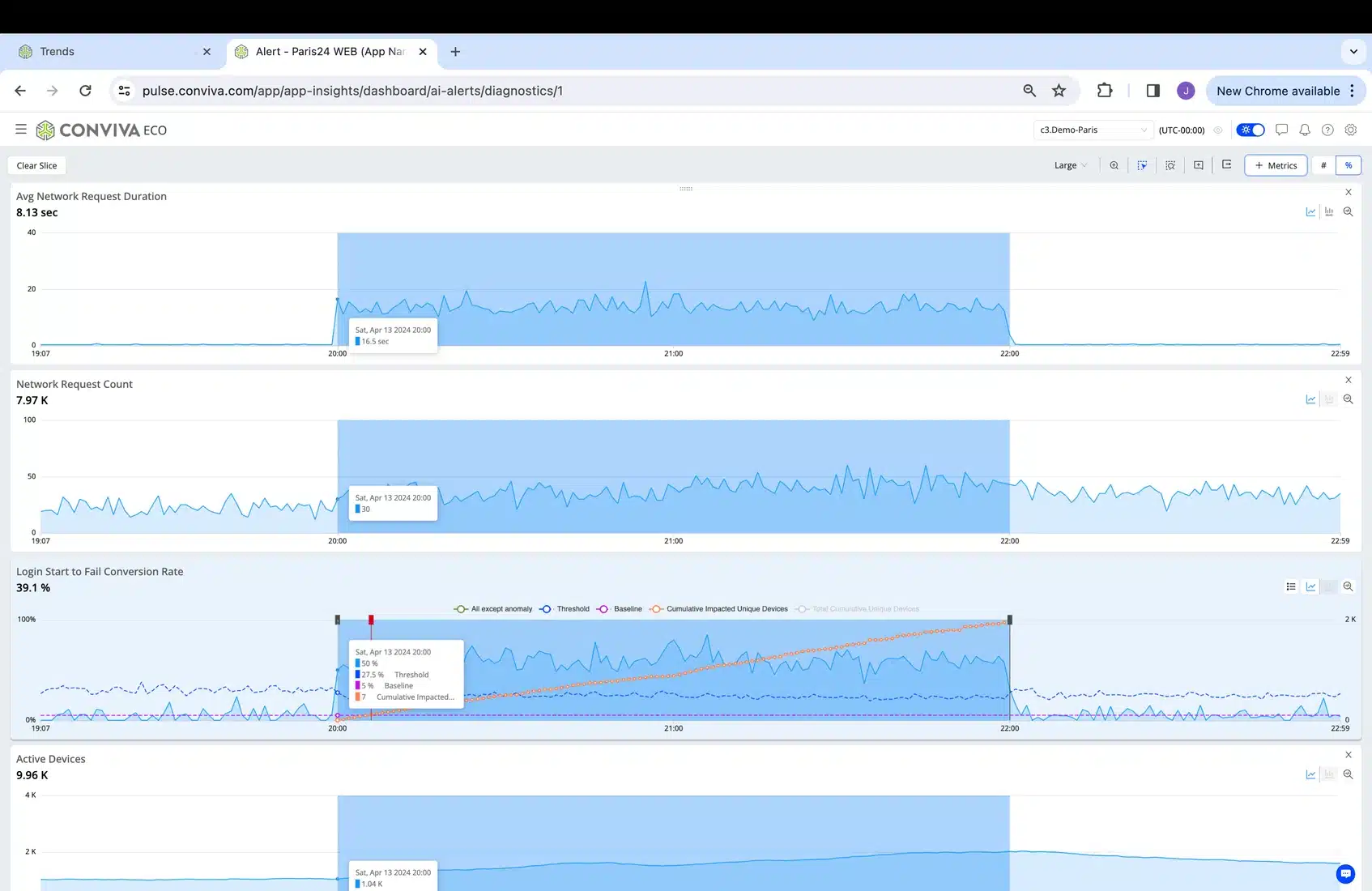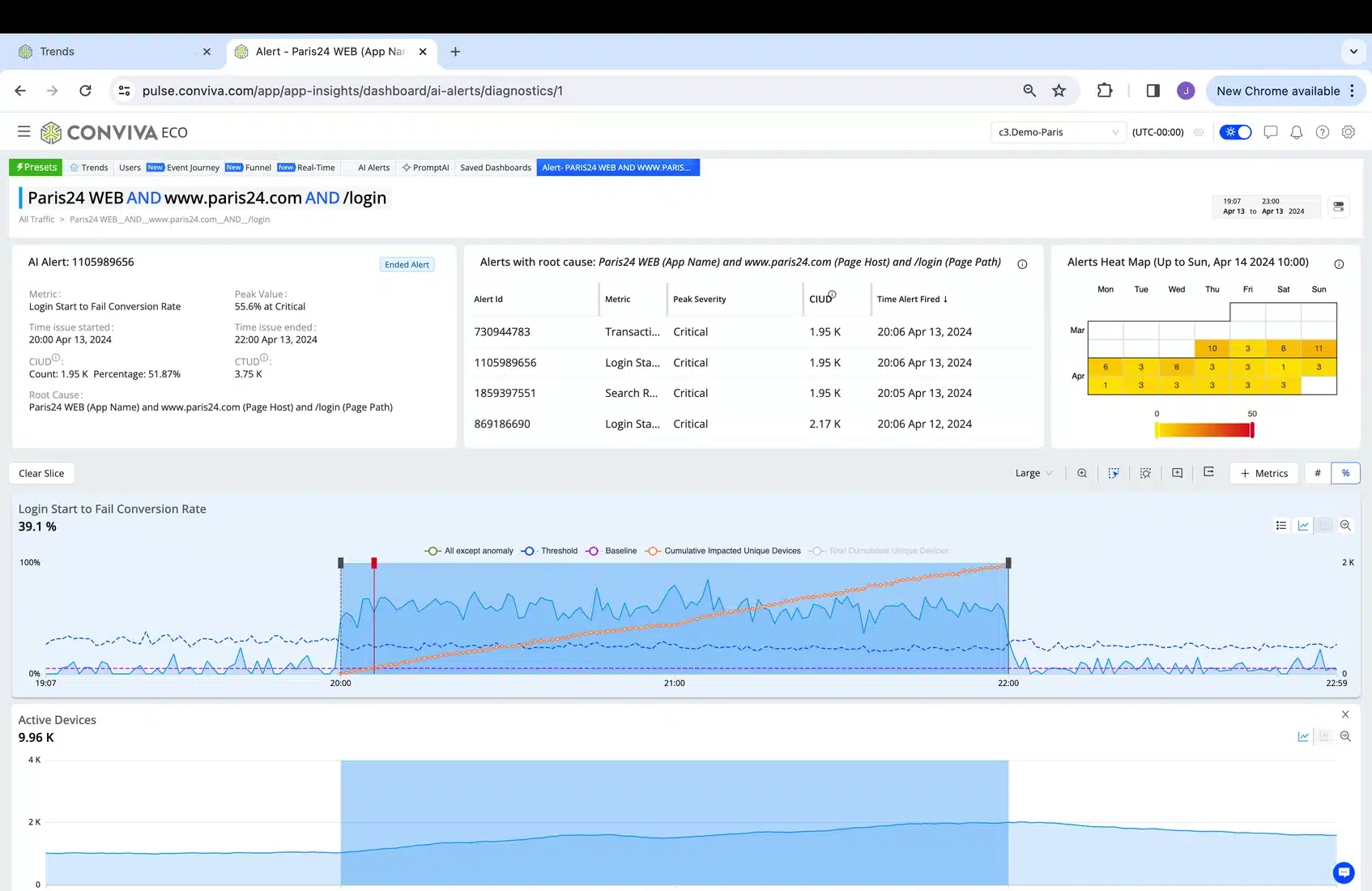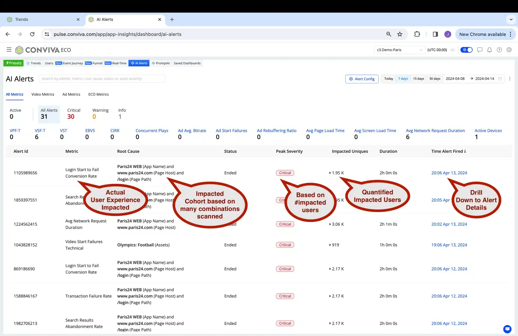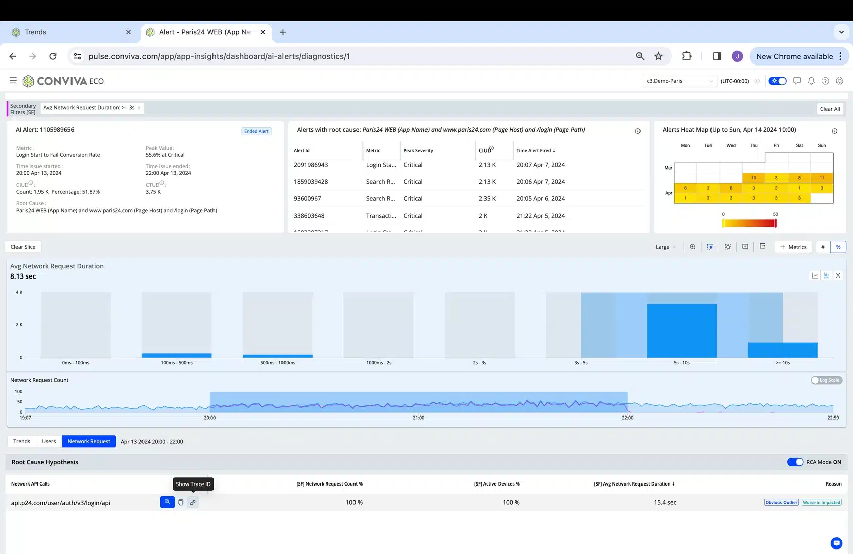 1. The image below shows a proactive real-time AI Alert received via webhook or email or other notification channel, already indicating the actual user experience (represented by a user defined stateful metric) that was impacted. You can see the impacted cohort (Paris24 Web App on login page) and the number of impacted users (this number will grow in real-time during the alert – the example below is an ended alert so 1.95K is the final number). Again, even more important than the workflow which follows is the ability to compute Stateful Metrics that represent actual user experience, in real-time, at scale and cost efficiently.
