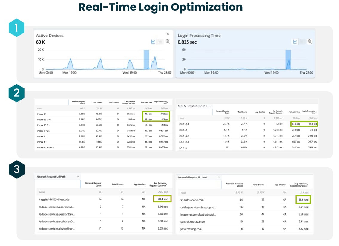 Step 3: Drilling into the network request path and URL host uncovers that the culprit for the long login time on these specific iOS devices is a third-party authentication call to Adobe. That is actionable feedback for the iOS developer to address, and fixing it will directly improve the user experience in the app.