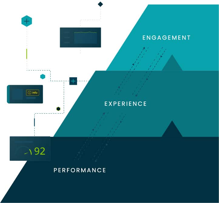In other words, engagement (what the user does – e.g., click or not click the purchase button), must connect with experience (what the user is presented with – e.g., a cumbersome purchase flow) and with performance metrics (e.g., long page load times for the purchase screen, payment gateway CPU overload, etc.)