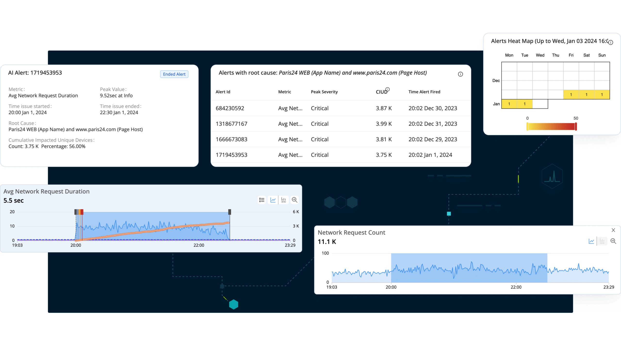 Whether alerting on average network request duration, average screen load time, average page load time, or a sudden drop in active devices, the incident will escalate from Info, through Warning, to Critical level, depending on the scale and severity of the issue. Every AI Alert also arrives with full context and in-depth reasoning for why it was fired, including a timeline and a spotlight on impacted metrics. This gradation and contextualization of alerts enables teams to respond appropriately to any issue, whether it’s a complete outage that needs immediate attention or a small issue slowing down backend processes.