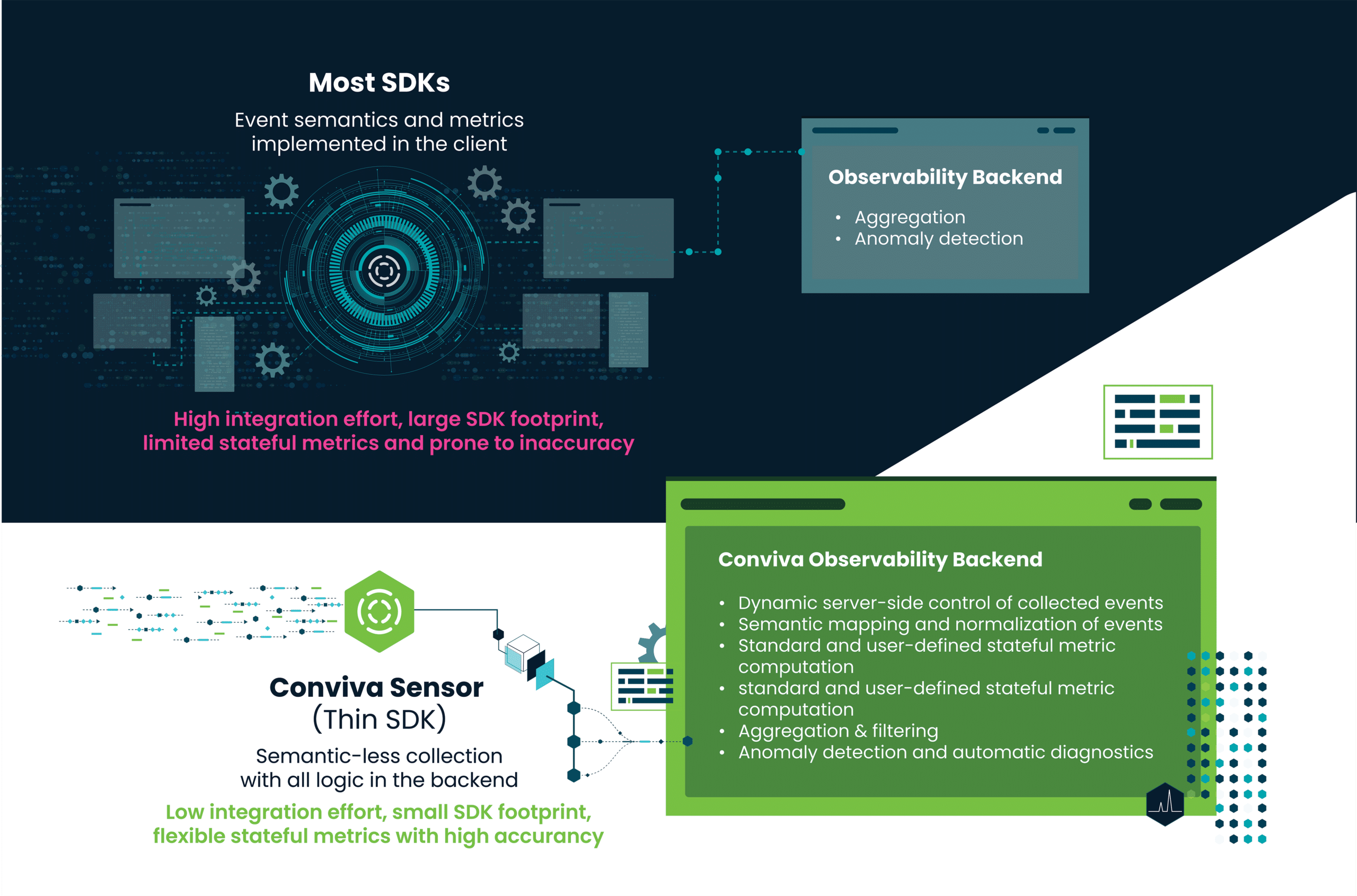 Notably, these metrics are stateful: they are based on the concept of a session (continuous flow of data from a single client) where what matters is the previous state/condition that triggered the transformation. Conviva Time-State computation technology addresses this challenge. Traditional SQL-based, table-and-count solutions weren’t designed for that.