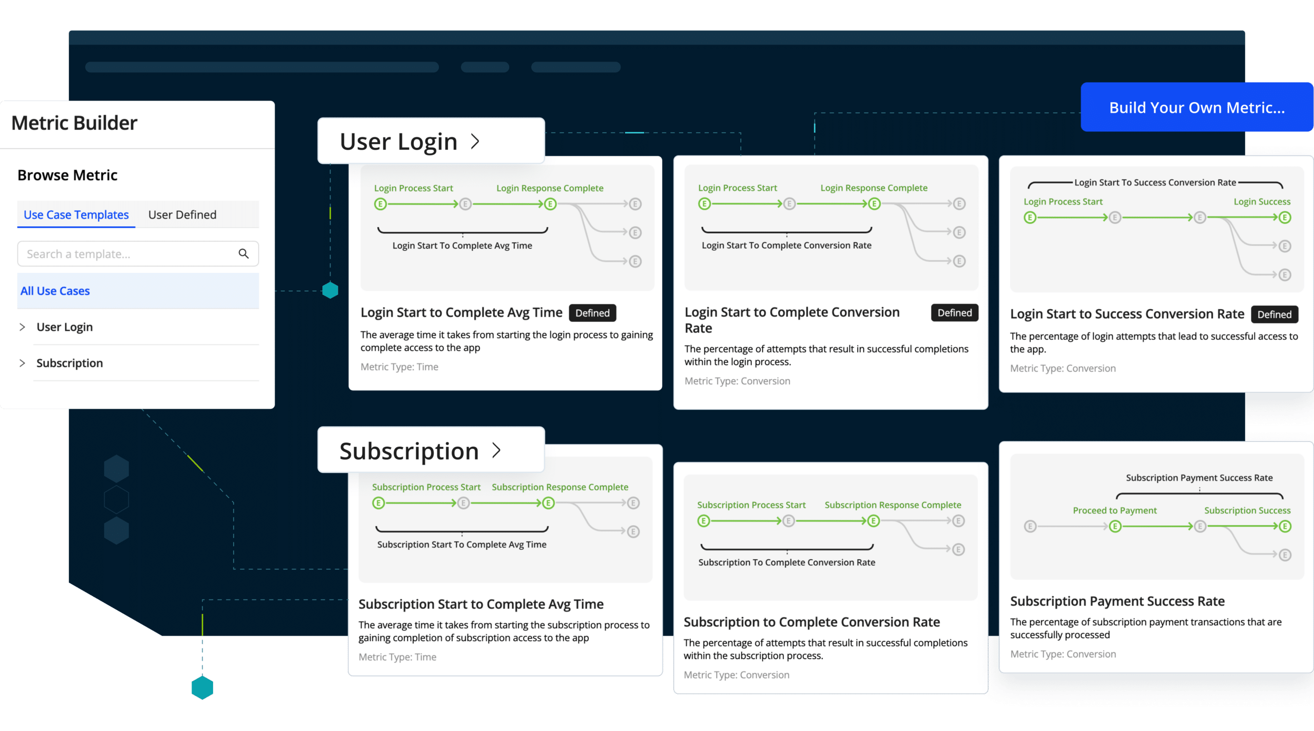 - Metric Builder: this tool allows you to create Time-State metrics using the business events set up in the Semantic Mapper. You can connect important events into a key metric for your business, and then measure conversions, conversion rates, time intervals, and/or successful interactions for the workflow between those events. With custom metrics, you can now collect data on which workflows are critical to the success of your application and measure in the moment how well your customers are achieving those workflows.
