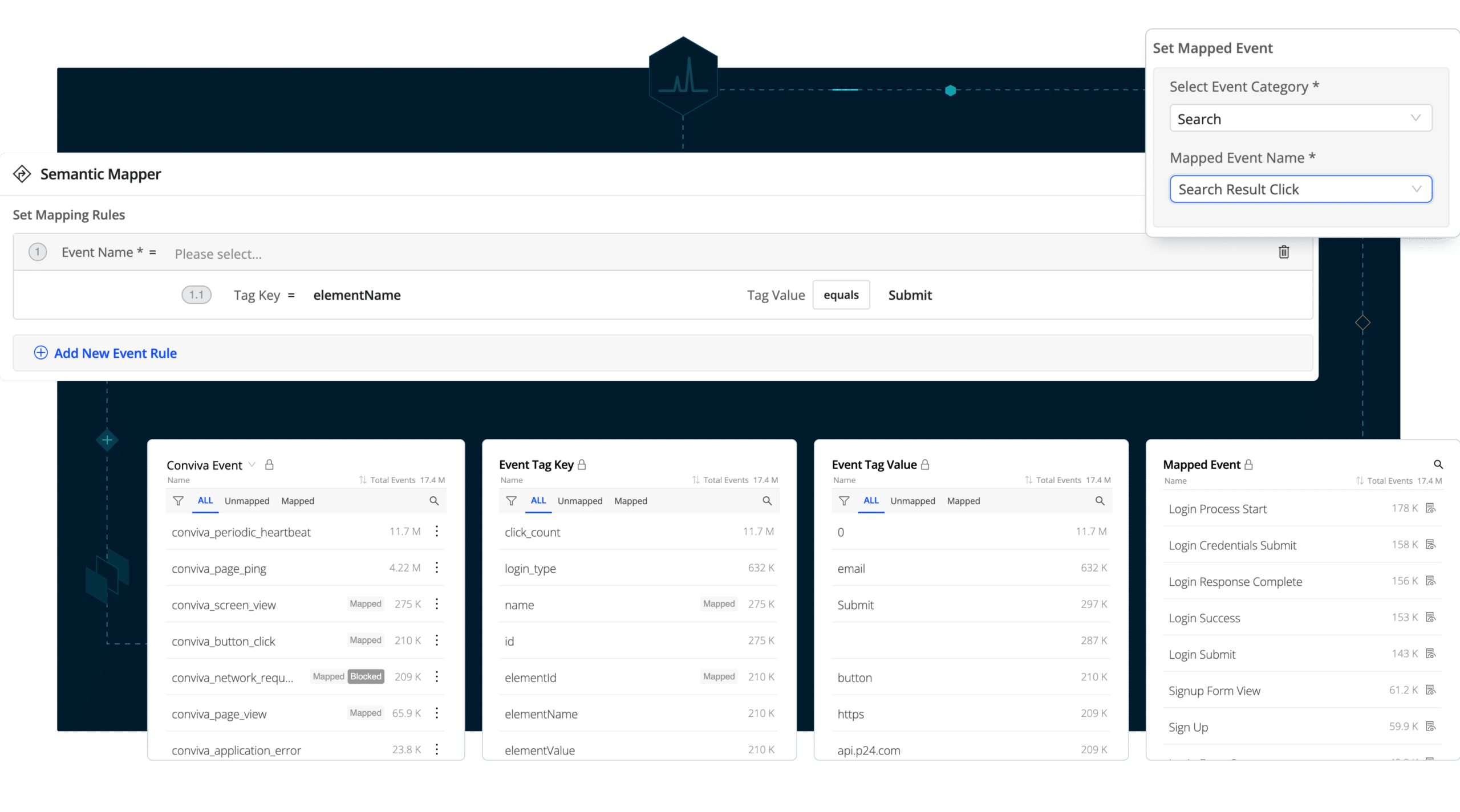 - Semantic Mapper: this tool allows you to translate raw events into business events—that is, common-sense events that have an impact on your business operations. This happens in Conviva’s back-end, where you can manipulate variables through an extremely intuitive UI, so that you can surface desirable information immediately, instead of having to search it out manually from the raw data.