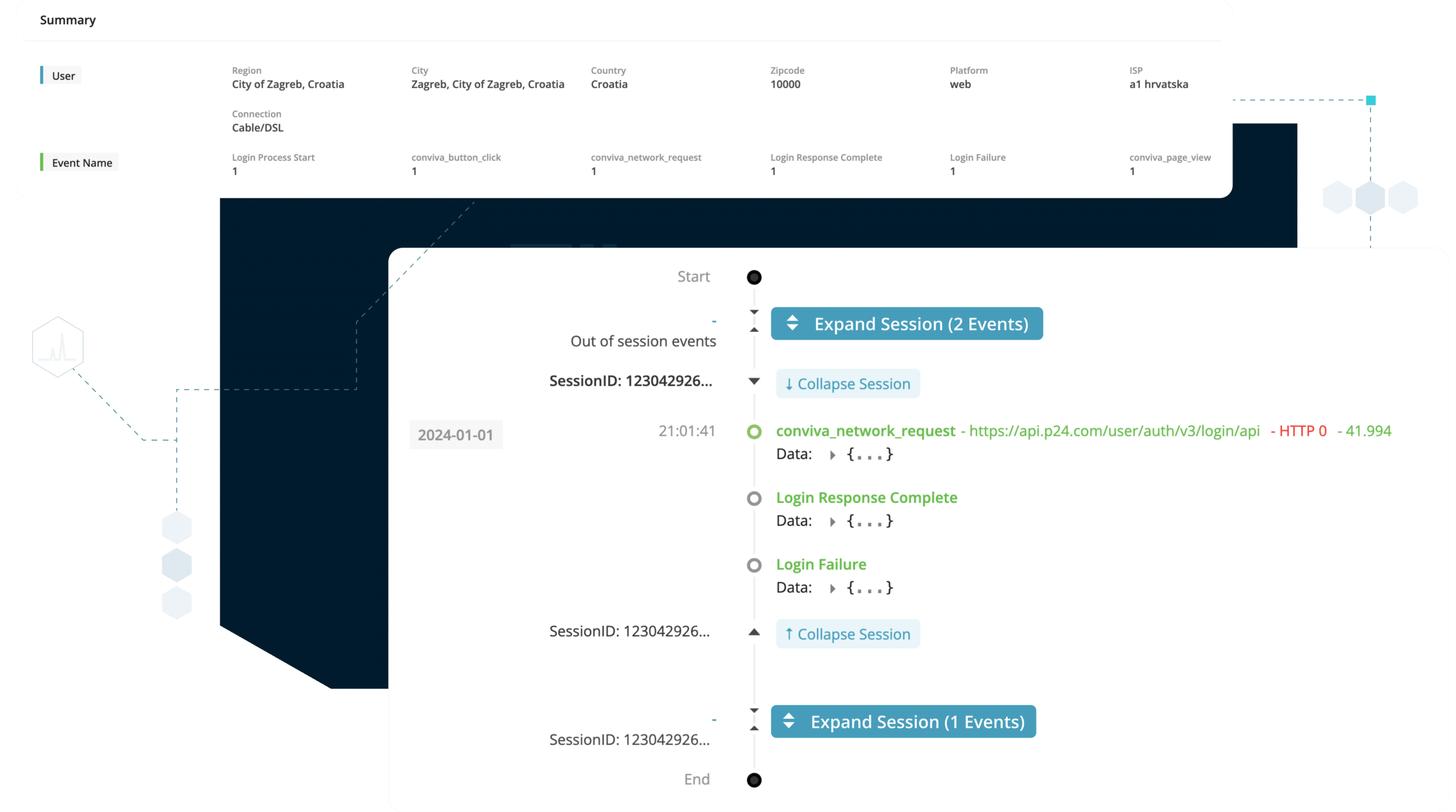 Conviva’s platform also sessionizes all data—that is, it keeps the stateful track of event sequence. This allows you to isolate the diagnostic space down to only impacted sessions, so you can pinpoint any correlation to other events— without the need to build a funnel manually.